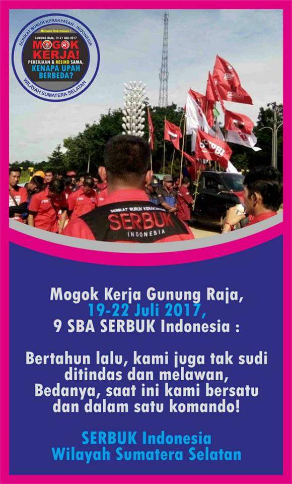 Jakarta – Federasi Perjuangan Buruh Indonesia (FPBI-KPBI) mendukung mogok kerja Federasi Serikat Buruh Kerakyatan (FSERBUK-KPBI) di kawasan PLTU Gunung Raja, Muara Enim, Sumatera Selatan. Mogok ini akan dilakukan serentak di 9 perusahaan pada tanggal 19-22 Juli 2017.