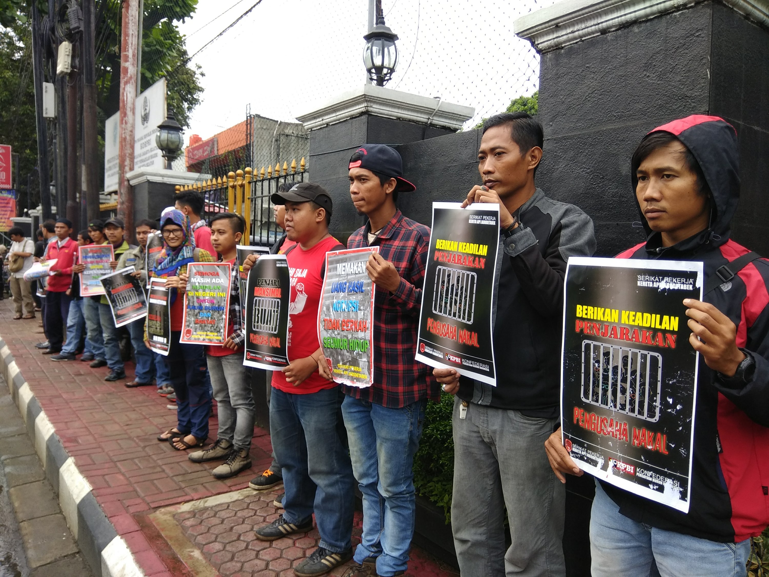 Jakarta – Puluhan Buruh yang tergabung dalam Serikat Pekerja Kereta Api Jabodetabek (SPKAJ-KPBI) hari ini melakukan aksi di depan Pengadilan Negeri Jakarta Selatan. Aksi ini dimulai dari pukul 12.00 WIB untuk mengawal persidangan terhadap pengusaha PT Kencana Lima yang dilaporkan oleh pekerjanya karena telah membayar upah dibawah ketentuan.