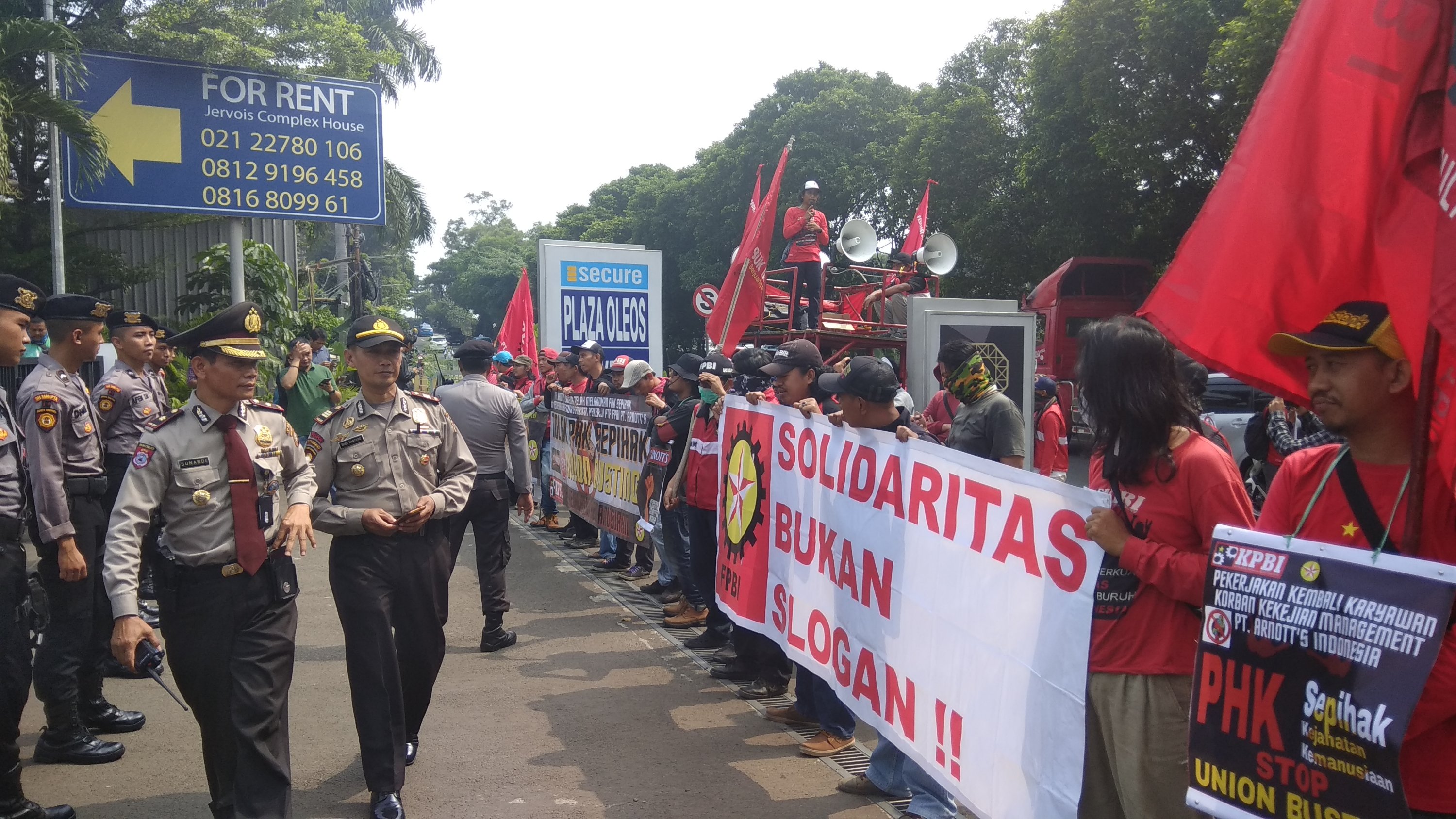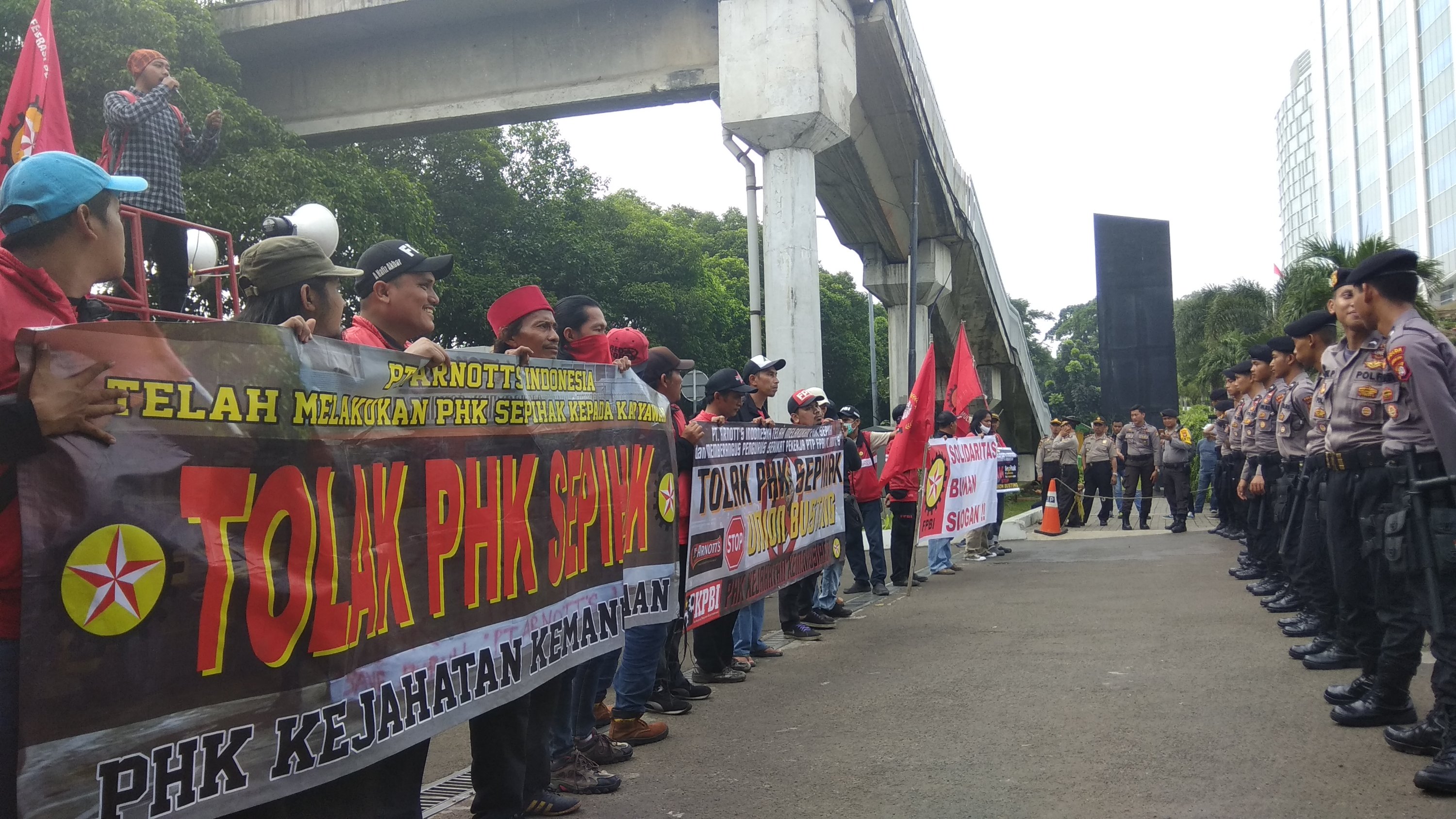 Jakarta – Sekitar 300an buruh dari Federasi Perjuangan Buruh Indonesia (FPBI-KPBI) berunjukrasa menolak PHK liar terhadap 300 karyawan tetap di produsen makanan PT Arnott’s Indonesia sejak 28 Mei 2018. Perusahaan yang memproduksi Tim Tam, Nyam Nyam, dan Good Times itu juga merekrut ratusan karyawan kontrak untuk menggantikan para pekerja tetap yang di-PHK sepihak.